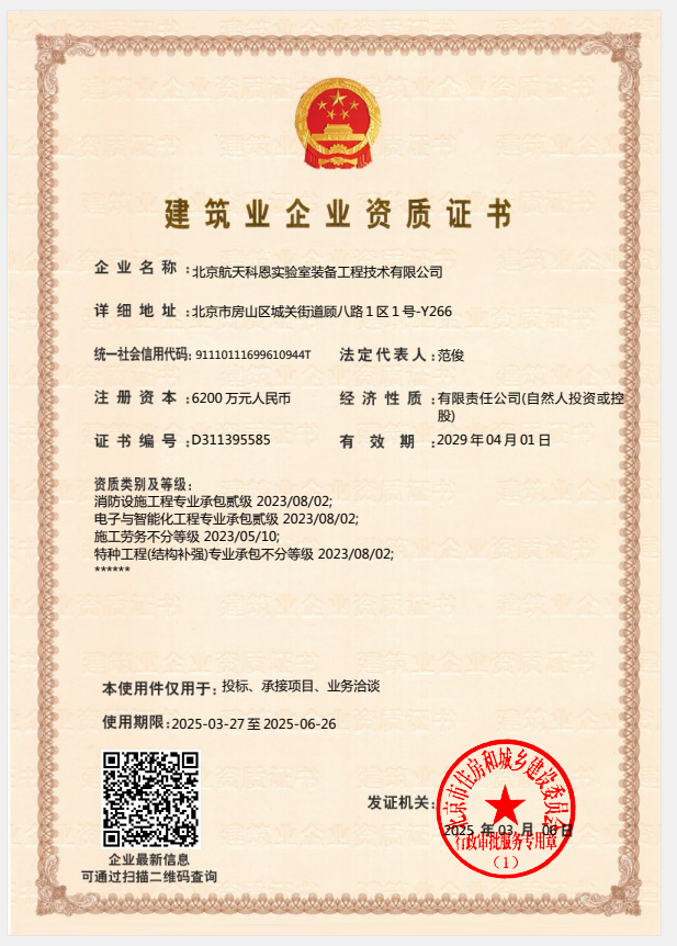 湖北航天科恩實(shí)驗(yàn)室裝備工程技術(shù)有限責(zé)任公司專注實(shí)驗(yàn)室建設(shè)EPC總承包,包括實(shí)驗(yàn)室規(guī)劃;實(shí)驗(yàn)室設(shè)計(jì);實(shí)驗(yàn)室裝修;實(shí)驗(yàn)室改造;實(shí)驗(yàn)室施工;實(shí)驗(yàn)室暖通系統(tǒng);實(shí)驗(yàn)室廢氣廢液處理;實(shí)驗(yàn)室供氣、水電系統(tǒng);實(shí)驗(yàn)室家具生產(chǎn)定制安裝銷售;實(shí)驗(yàn)室相關(guān)配件供應(yīng)等。我們有20多年的實(shí)驗(yàn)室工程實(shí)施行業(yè)經(jīng)驗(yàn),合作客戶10000+,資質(zhì)齊全(實(shí)驗(yàn)室EPC總承包、建筑機(jī)電安裝工程專業(yè)承包叁級(jí)、環(huán)保工程專業(yè)承包叁級(jí)、建筑裝飾裝修工程專業(yè)承包貳級(jí)),售后完善,歡迎咨詢和考察。